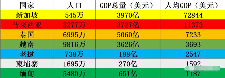 其中,2021年,越南人口9816万,GDP3626亿美元,老挝人口738万,GDP188亿美元,泰国人口6995万,GDP5060亿美元,缅甸人口5480万,GDP651亿美元,柬埔寨人口1695万,GDP270亿美元,马来西亚人口3277万,GDP3727亿美元,新加坡人口545万,GDP3970亿美元。